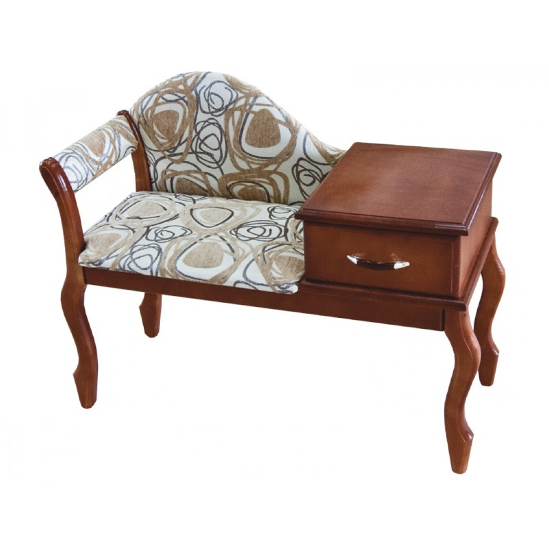 Банкетка в прихожую из массива сосны с мягким сидением и тумбой с выдвижным ящиком для хранения ключей и прочих мелочей. Тонировка - орех темный.