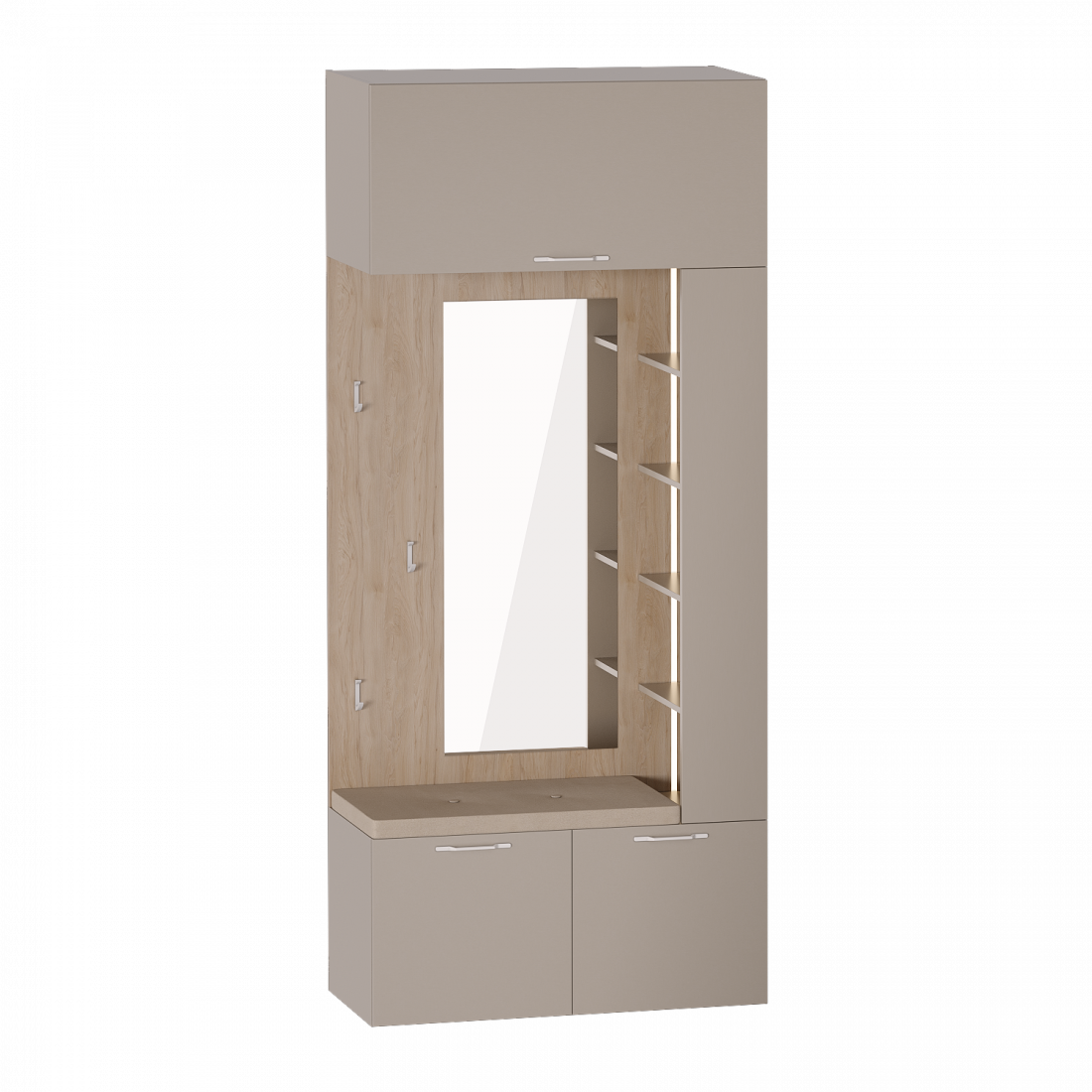 Модуль "Вешалка с зеркалом" выполнен из ЛДСП цвета Дуб натуральный светлый / Капучино. Верхняя полка модуля имеет встроенный газлифт и позволит разместить объемный чемодан. Вертикальный ряд полок со светодиодной подсветкой выполнен на правую сторону, при желании можно распахнуть створку, прикрывающую ряд. Прочные крючки выполнены из белого матового металла.