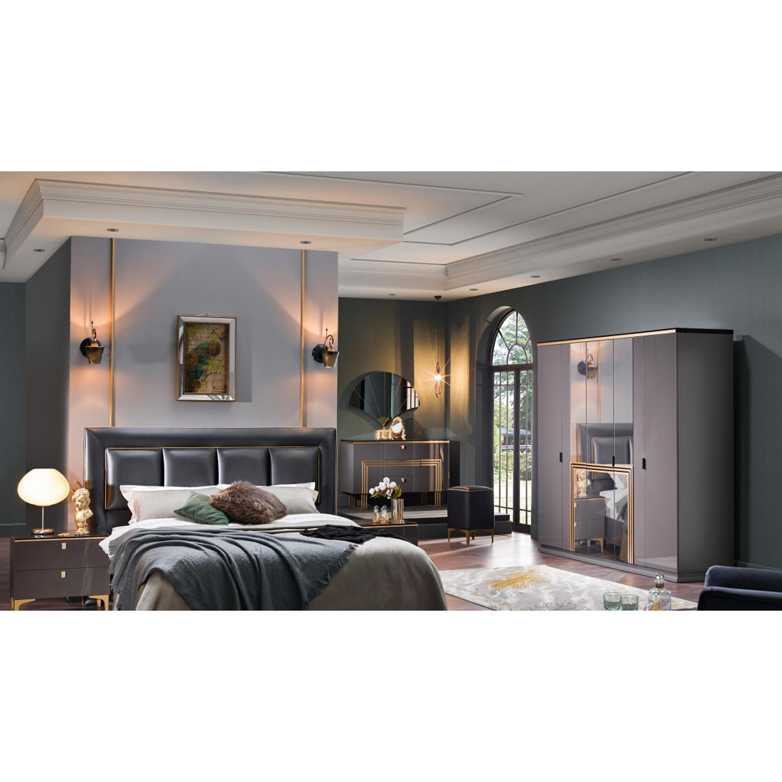 Шкаф Carlino Bellonaв вместительный предмет интерьера  с пятью распашными дверьми, в котором поместится очень много одежды и вещей. Три зеркальные двери с золотым декором по центу, крайние  двери цвета антрацит..